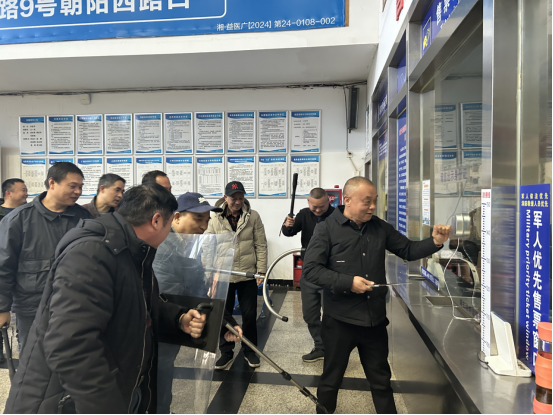 演練模擬“三品”檢查員在候車(chē)室入口發(fā)現(xiàn)有攜帶管制刀具的人員,要求其開(kāi)包檢查時(shí),“暴恐分子”拒絕接受檢查并持尖刀跑向售票處?,F(xiàn)場(chǎng)工作人員立即啟動(dòng)應(yīng)急處置預(yù)案,緊急疏散正在窗口購(gòu)票的旅客,并第一時(shí)間撥打“110”報(bào)警,報(bào)告給應(yīng)急領(lǐng)導(dǎo)防暴小組組長(zhǎng)。隨后應(yīng)急小組成員第一時(shí)間趕到暴恐分子聚集點(diǎn),緊急疏散候車(chē)室人群,組織反恐防暴小組成員利用反恐器材與“暴恐分子”對(duì)峙。經(jīng)過(guò)小組成員的冷靜處置,迅速制服了暴恐分子。